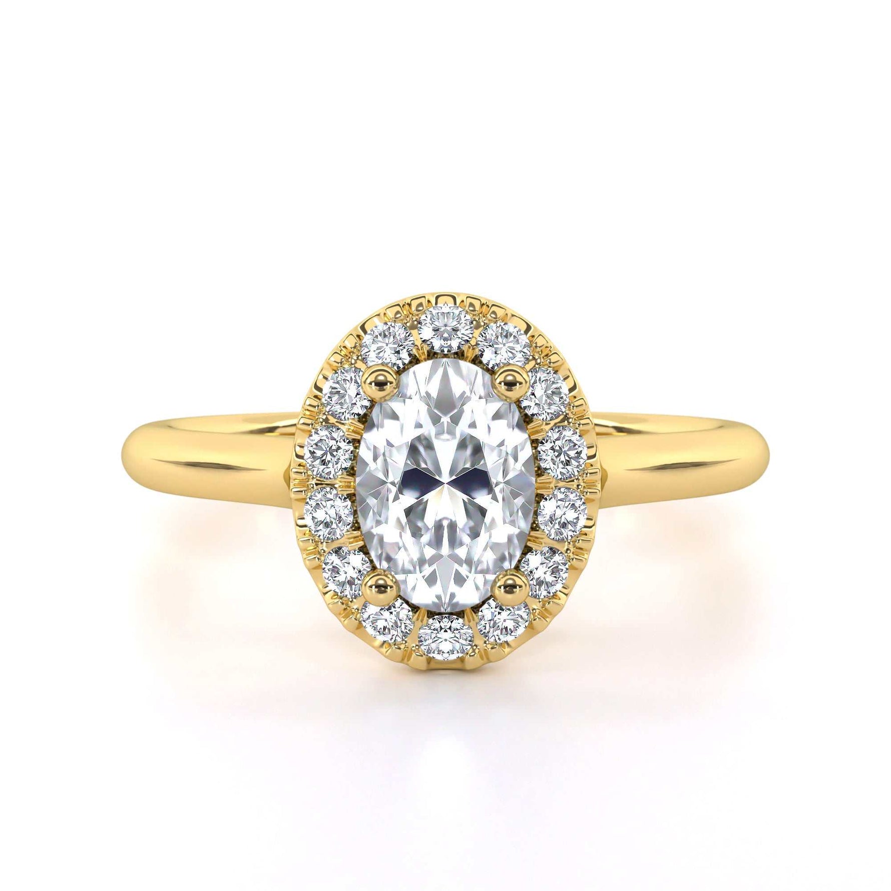 Expertly crafted with an oval cut diamond centre and surrounded by a micro set halo diamond, the Jennifer Oval engagement ring is a stunning and timeless piece. The unique cut and intricate setting create a dazzling display of brilliance, making it the perfect symbol of love and commitment. Experience the beauty and elegance of this exquisite ring.