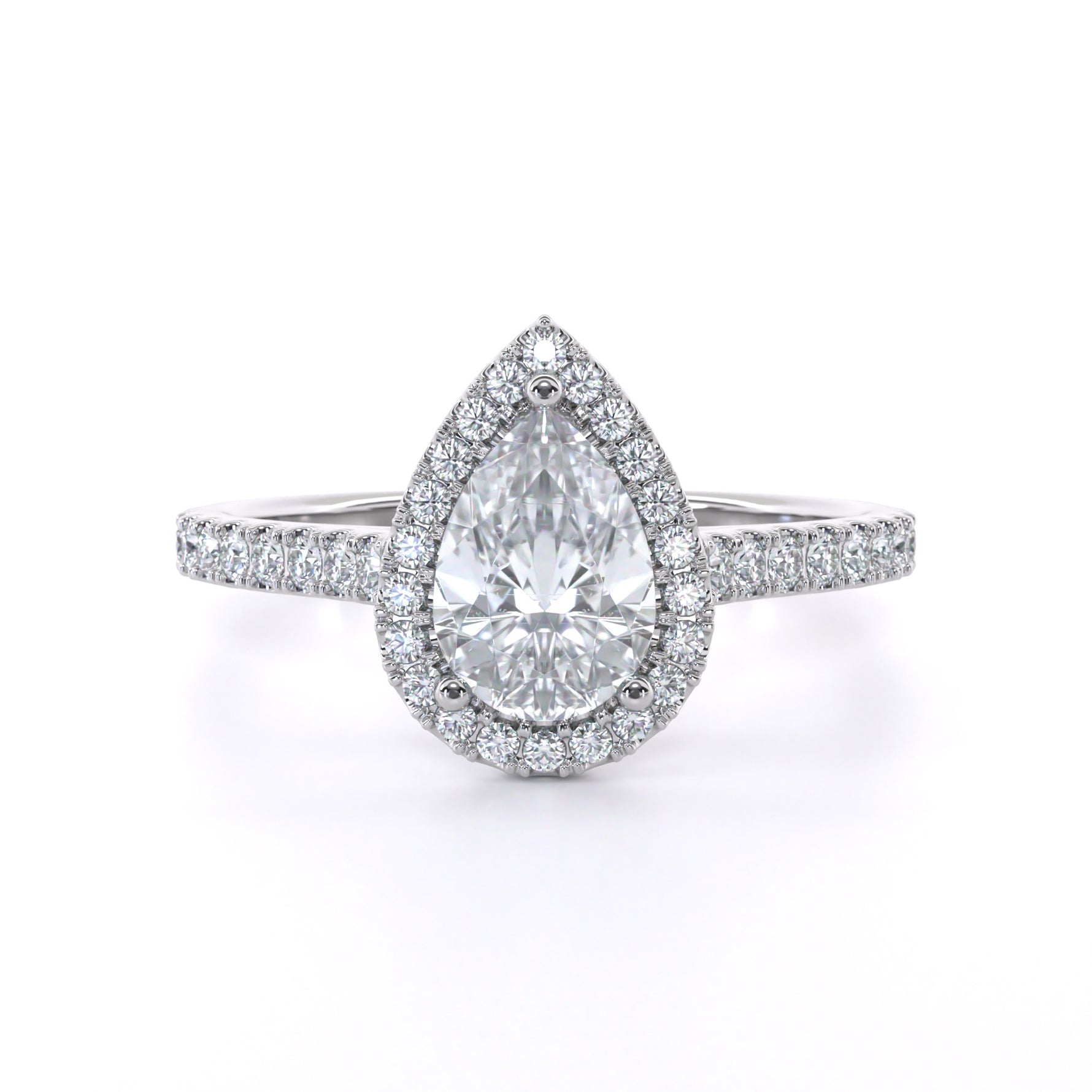 Introducing the Whisper pearshape halo diamond engagement ring, featuring an ultra-thin yet incredibly durable diamond halo and shoulder. Crafted for elegance and durability, this stunning ring is the perfect symbol of everlasting love. The Whisper ring will leave you speechless with its timeless beauty.