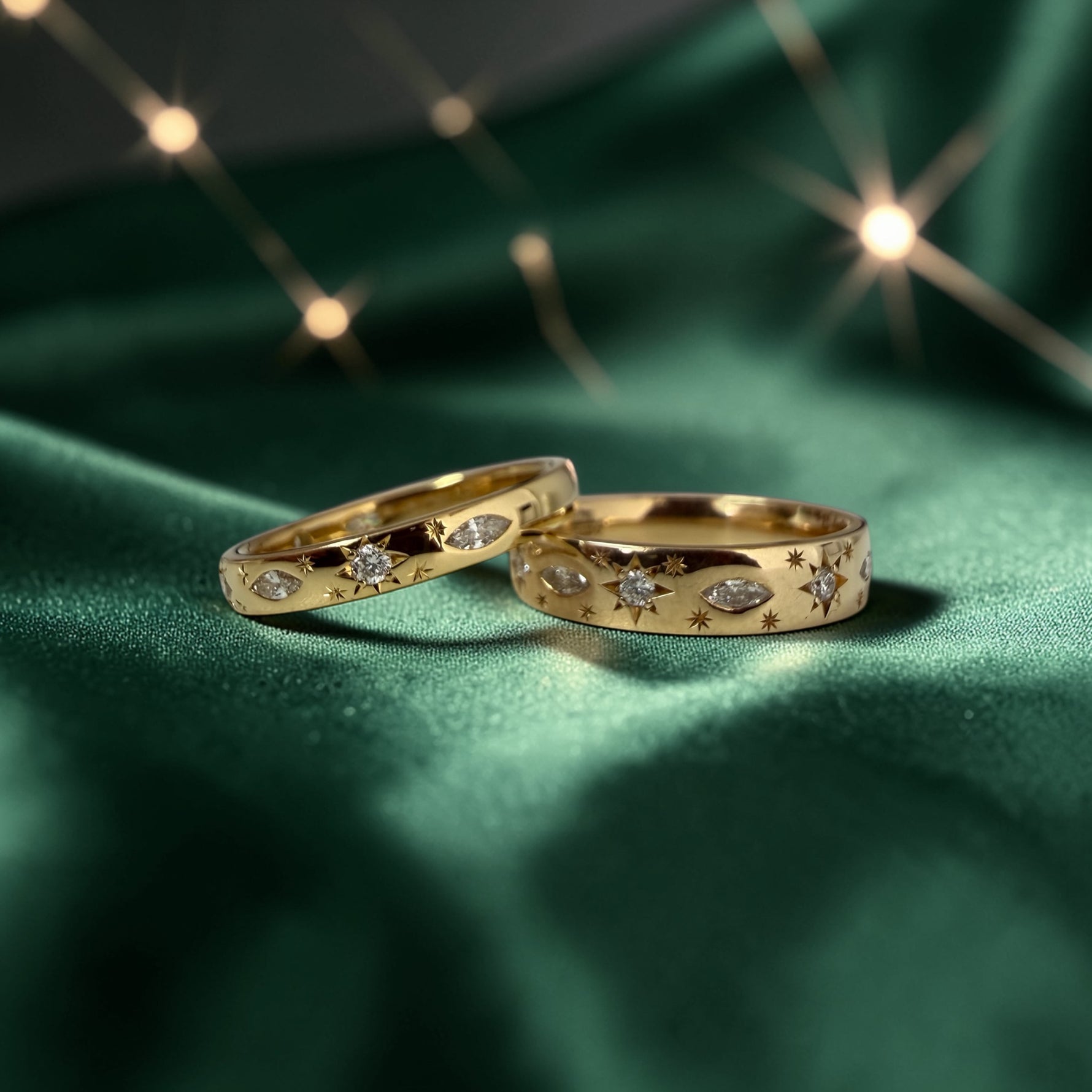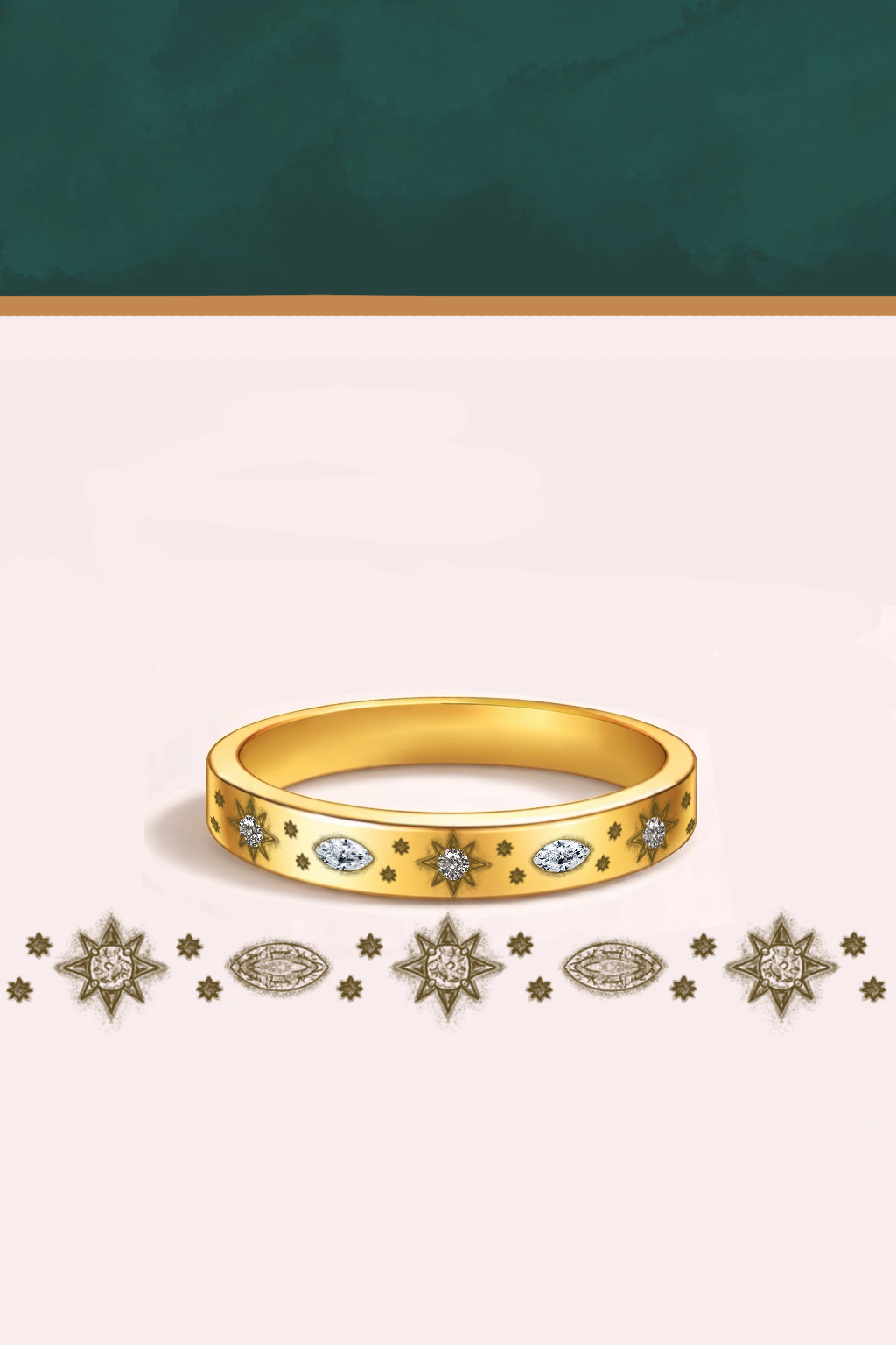 The Soph is a celestial-inspired eternity band featuring hand-engraved stars alongside flush-set marquise and round diamonds. Each star is meticulously carved by hand, creating a bespoke quality that celebrates the night sky. The band's versatile width options allow you to customise the design to suit your personal style, whether you prefer a delicate statement or a more substantial presence. Perfect as a wedding band, anniversary ring, or standalone piece, this design merges timeless elegance with cosmic symbolism.