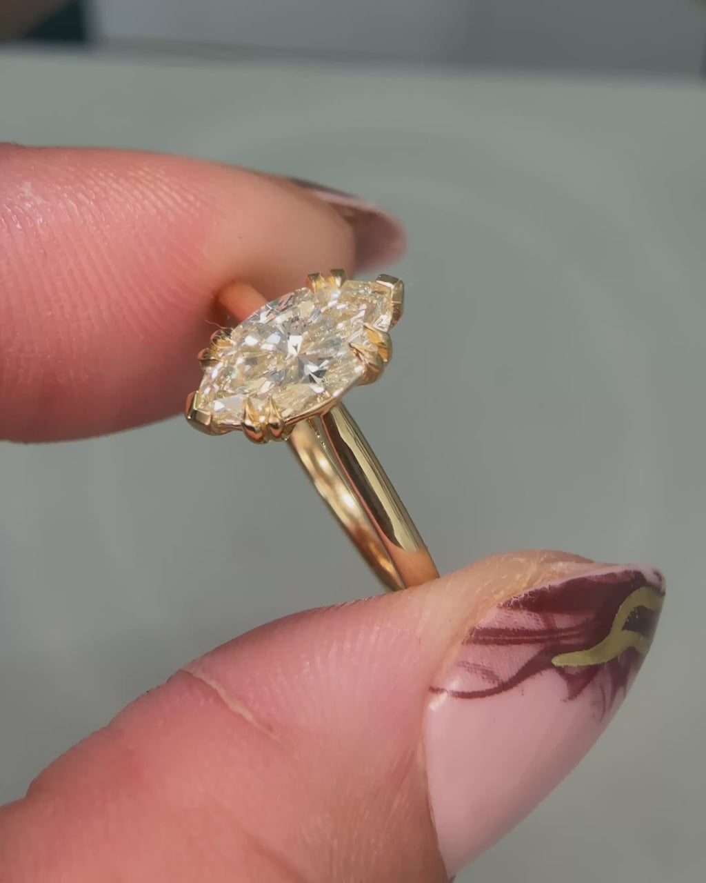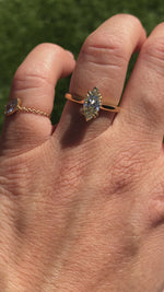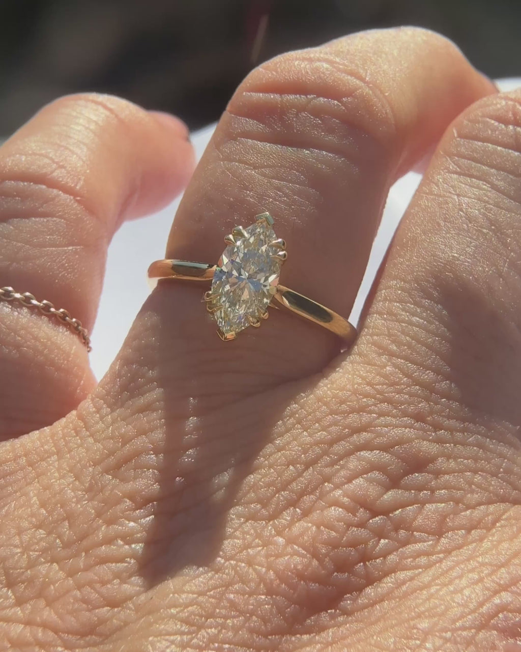 This Elegant ring features a warm-toned marquise cut diamond set in 18kt yellow gold, highlighting the classic solitaire design. The unique shape of the marquise diamond enhances finger elongation and adds a sophisticated appeal. Expertly crafted, this piece combines timeless style with refined craftsmanship, making it an exquisite choice for those seeking understated luxury.