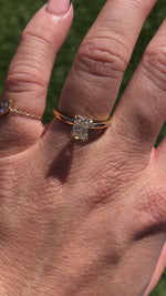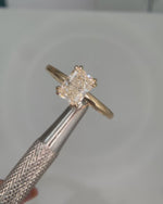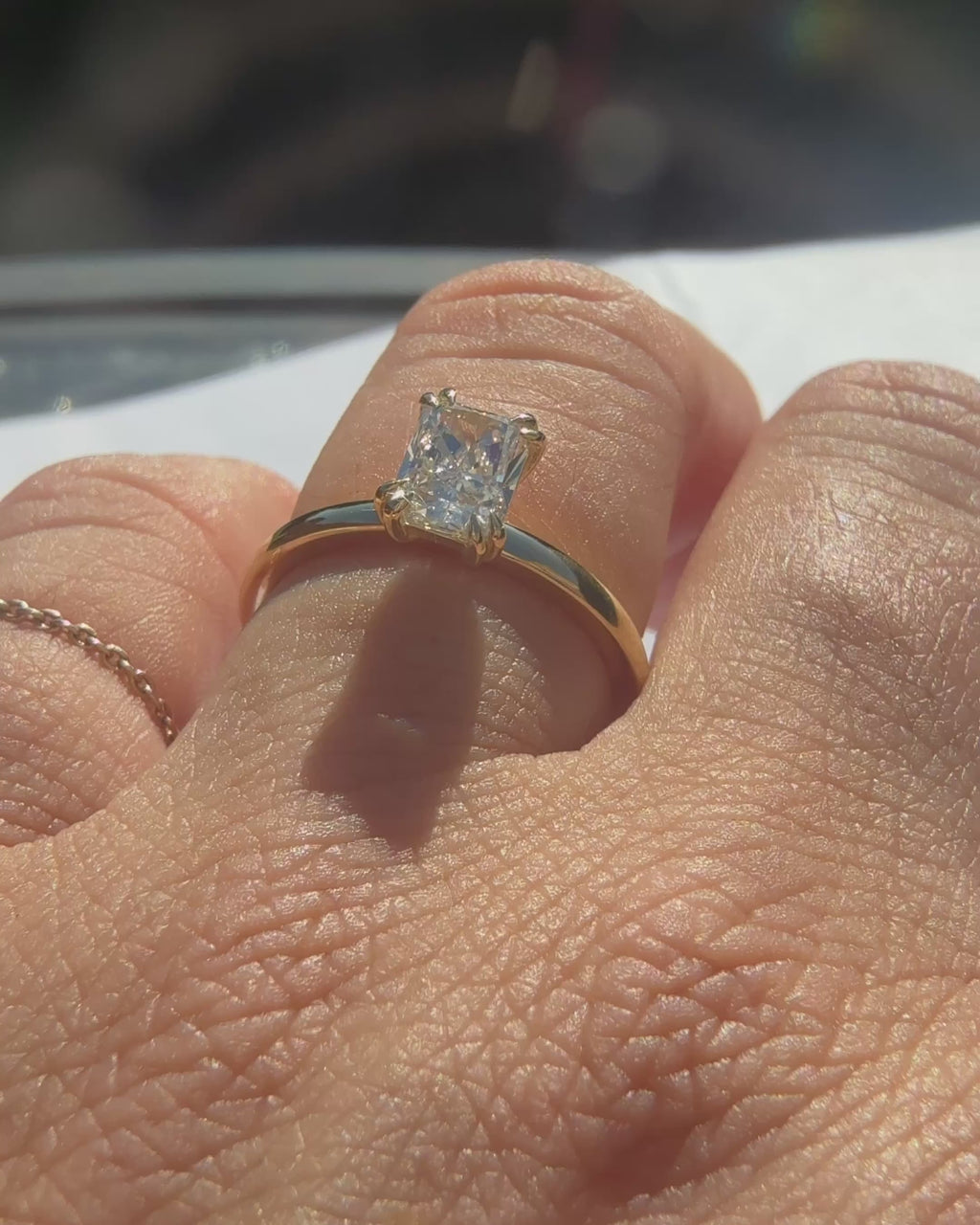 The Radiant Cut Diamond Maria Ring is meticulously crafted in 18KT yellow gold, showcasing a warm-toned, champagne-coloured radiant cut diamond. Secured by a double claw setting, this single-stone ring combines classic elegance with a subtle warmth, delivering a refined and timeless statement piece for discerning tastes.