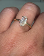 The Elongated Antique Cushion Cut Diamond Collette Ring features a warm-toned, spready cut diamond set in luxurious 18kt yellow gold. Its elongated cushion shape is beautifully framed by a diamond-set hidden halo, enhancing the diamond's brilliance while maintaining a refined silhouette. This expertly crafted ring combines contemporary elegance with timeless design, perfect for those who appreciate subtle sophistication and expert craftsmanship.