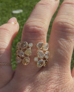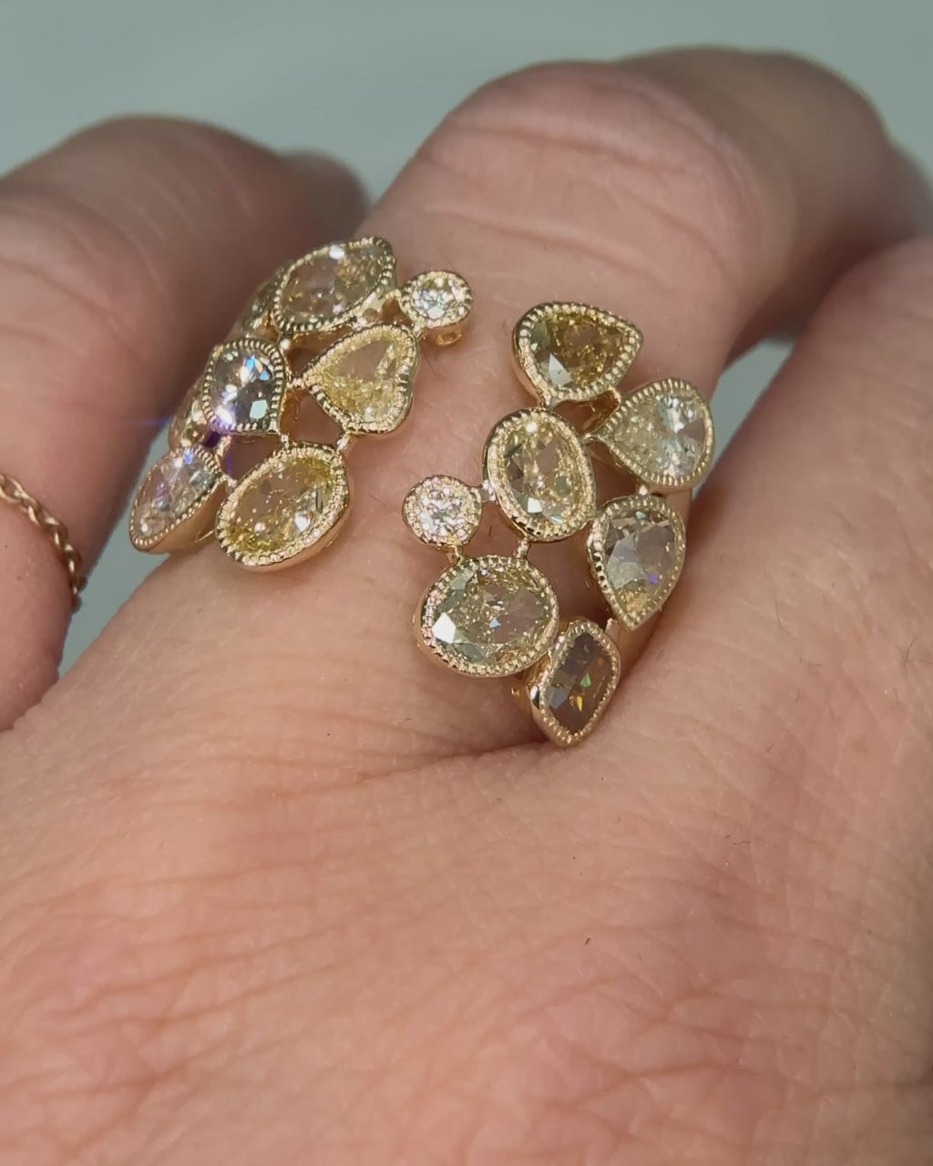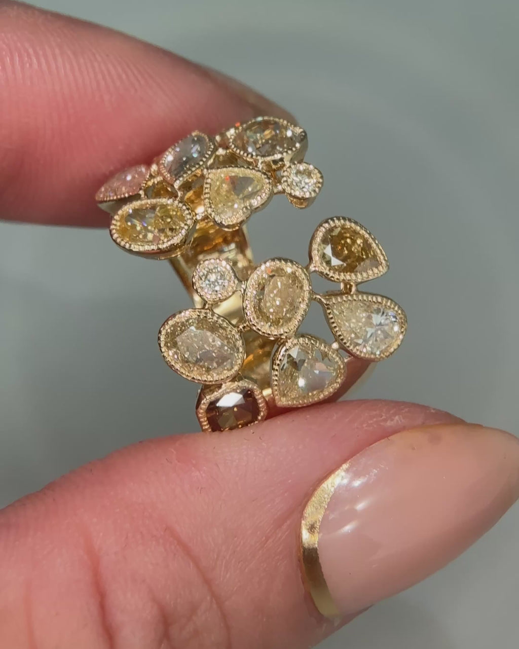 This 18kt yellow gold wide band showcases an exquisite array of mixed cut fancy colour diamonds in shades of pink, yellow, champagne, and brown. Each diamond is expertly set in a secure bezel setting accented with a milgrain edge, enhancing the ring’s intricate design. The combination of warm hues and refined detailing makes this piece a sophisticated choice for those appreciating vibrant and unique elegance.